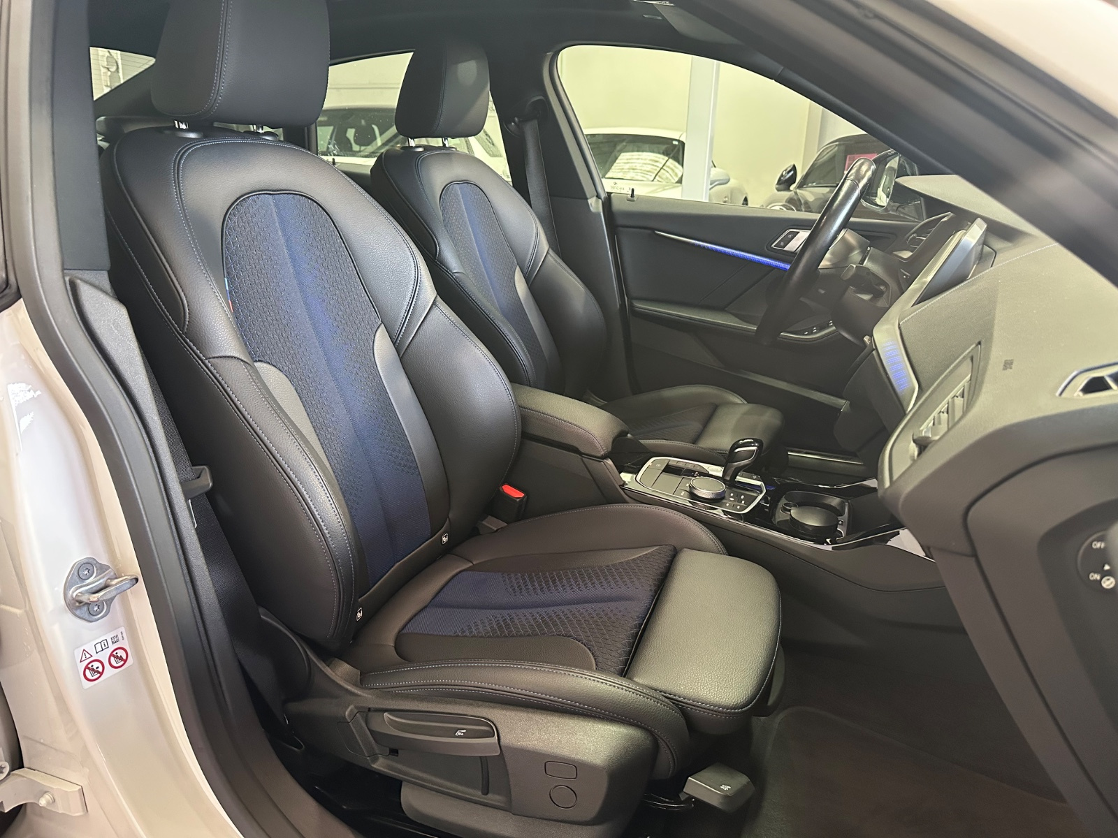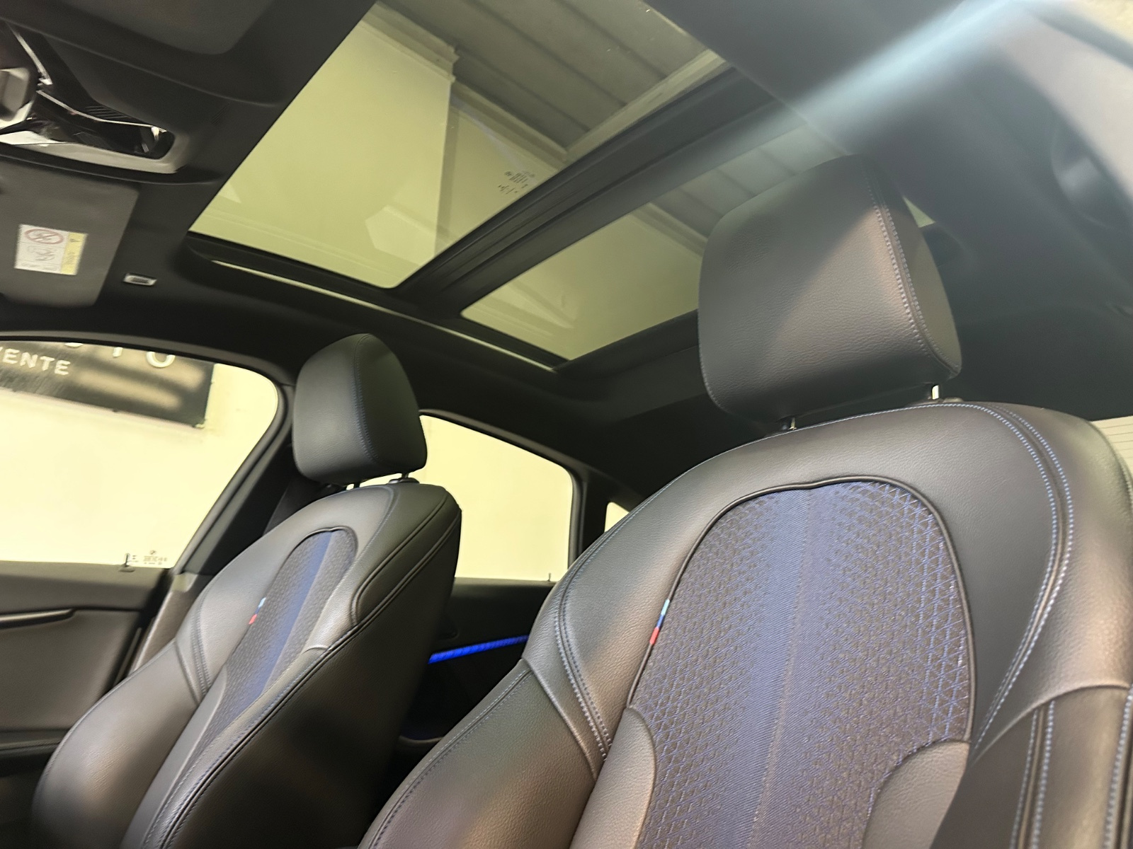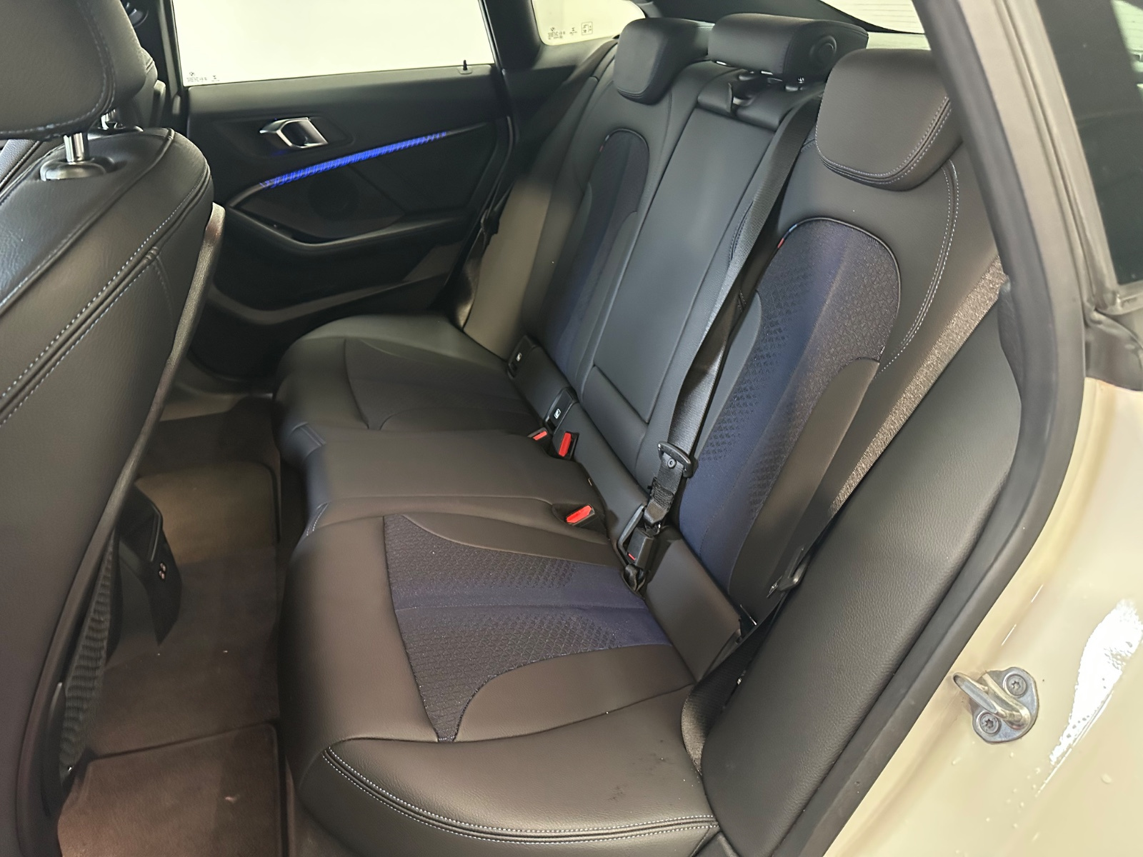 - Sellerie Cuir/Tissu avec surpiqûres bleues sur les sièges