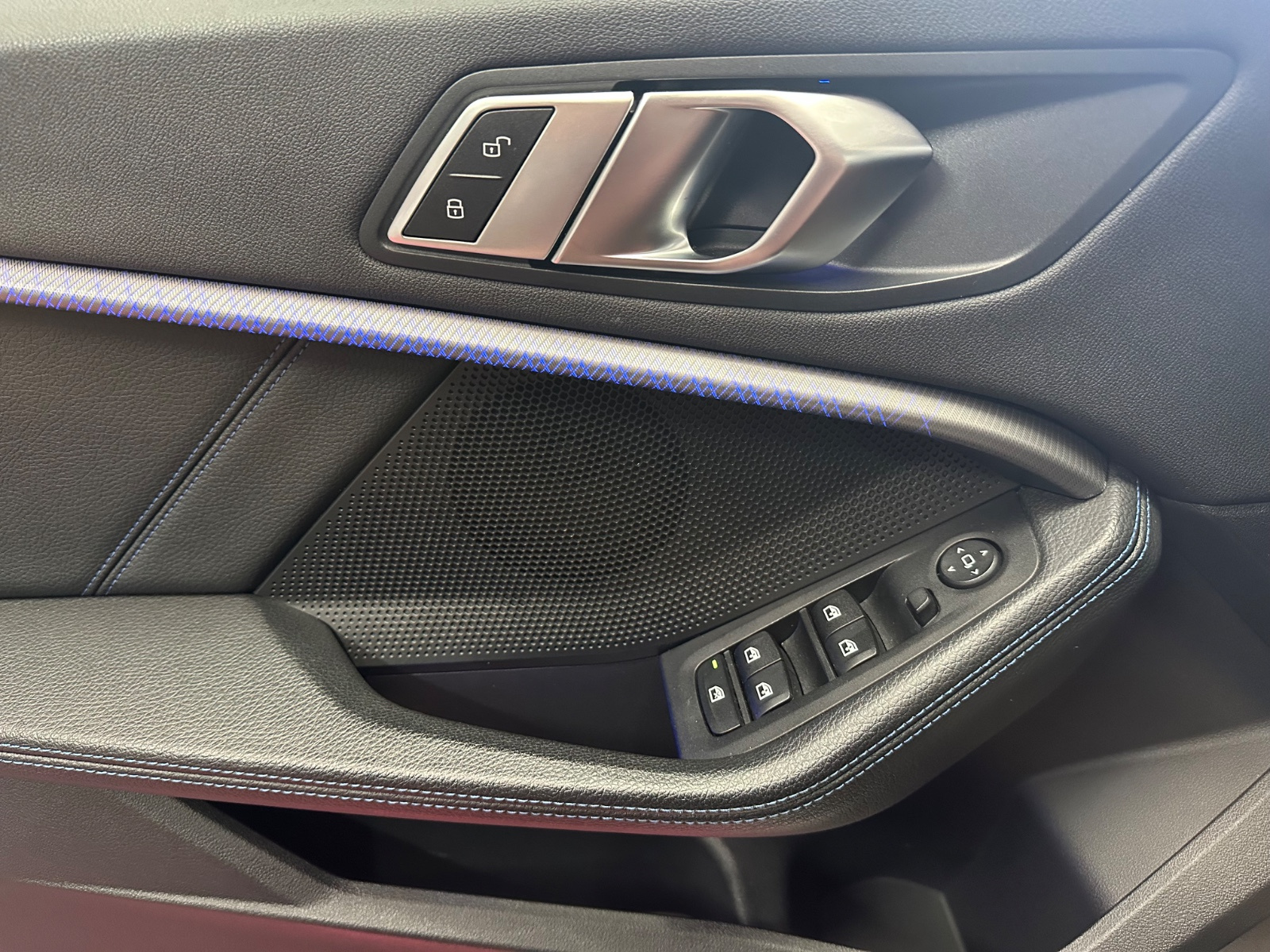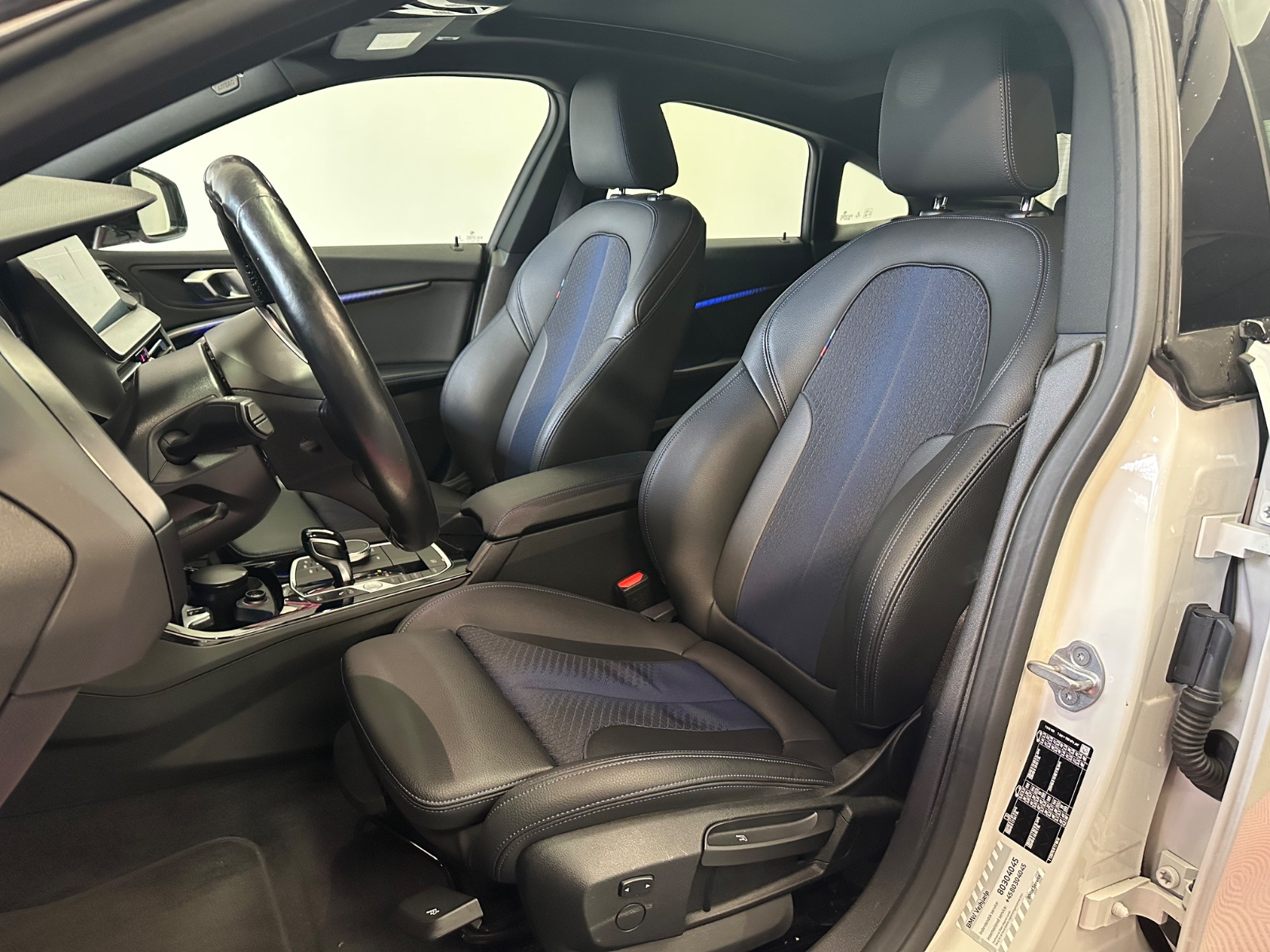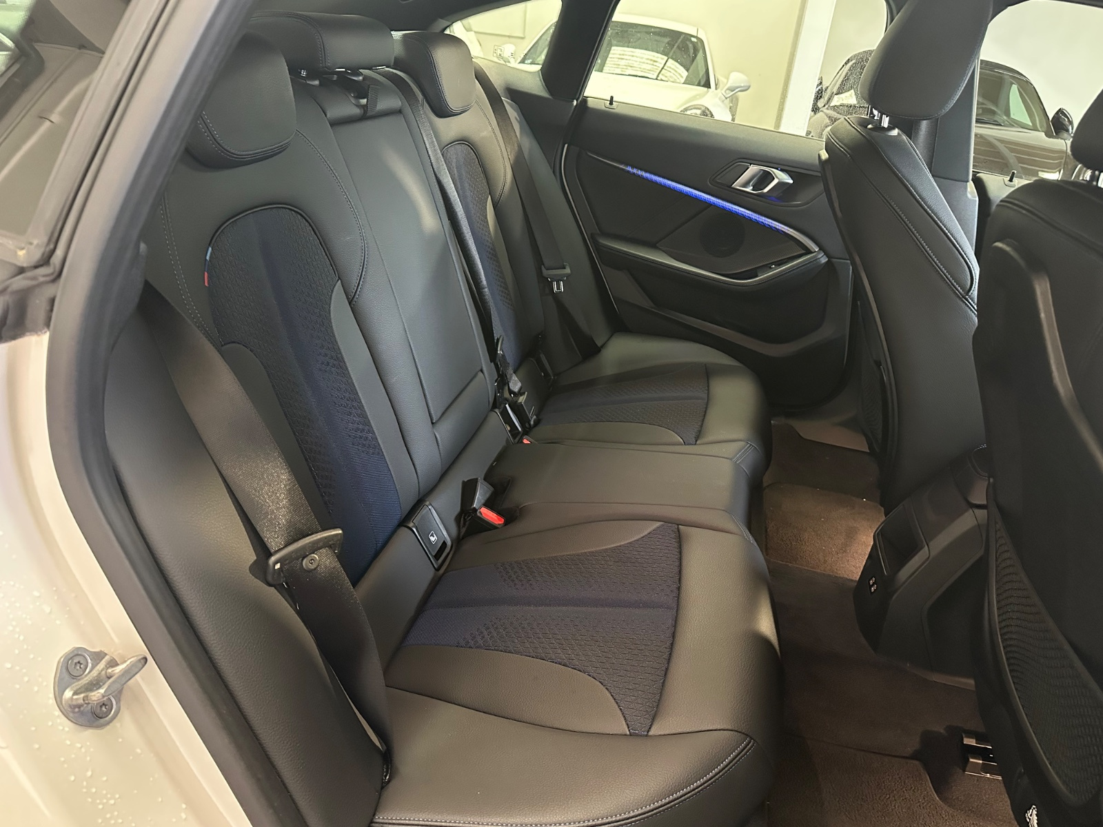 - Sellerie Cuir/Tissu avec surpiqûres bleues sur les sièges